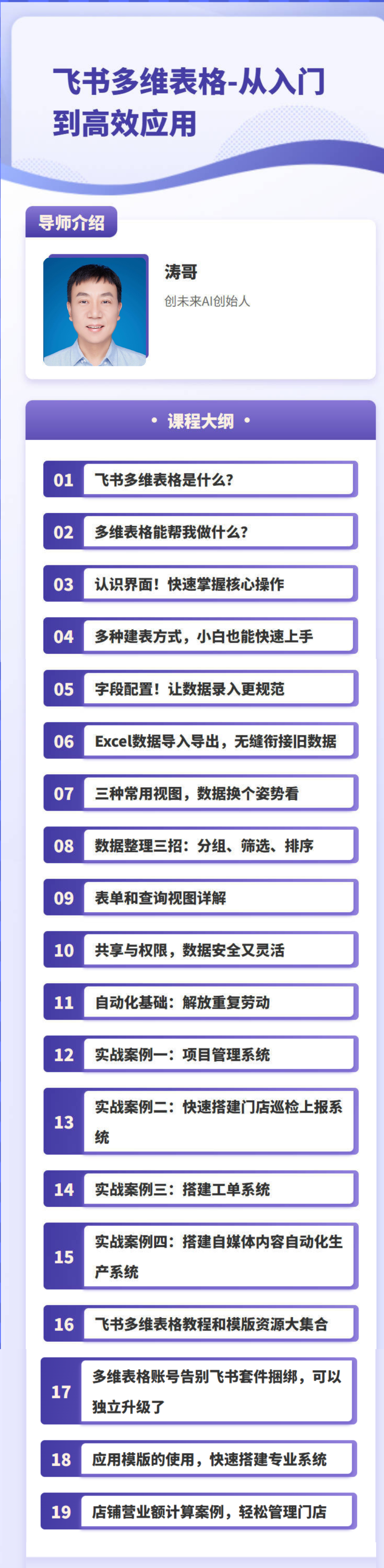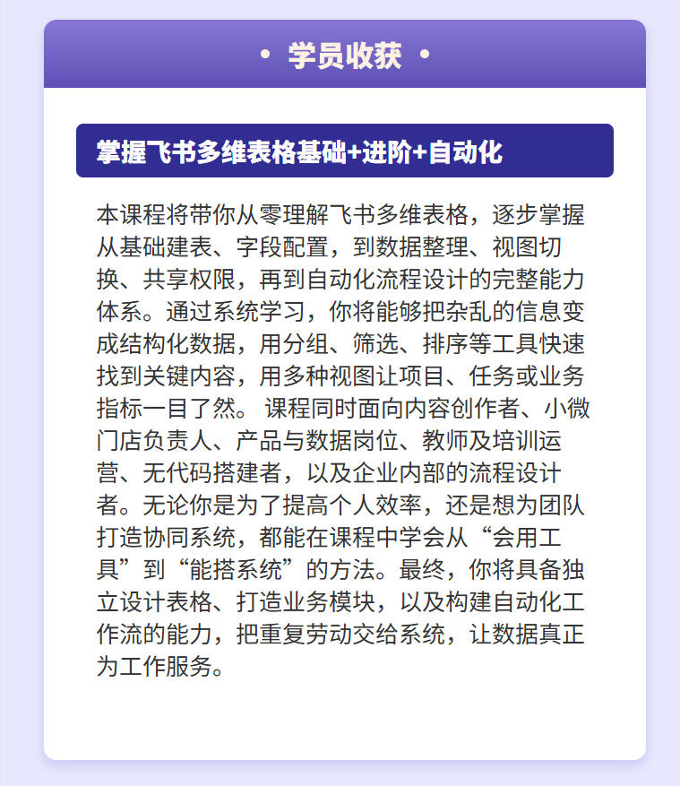 本课程将带你从零理解飞书多维表格,逐步掌握从基础建表、字段配置,到数据整理、视图切换、共享权限,再到自动化流程设计的完整能力体系。通过系统学习,你将能够把杂乱的信息变成结构化数据,用分组、筛选、排序等工具快速找到关键内容,用多种视图让项目、任务或业务指标一目了然。 课程同时面向内容创作者、小微门店负责人、产品与数据岗位、教师及培训运营、无代码搭建者,以及企业内部的流程设计者。无论你是为了提高个人效率,还是想为团队打造协同系统,都能在课程中学会从“会用工具”到“能搭系统”的方法。最终,你将具备独立设计表格、打造业务模块,以及构建自动化工作流的能力,把重复劳动交给系统,让数据真正为工作服务。