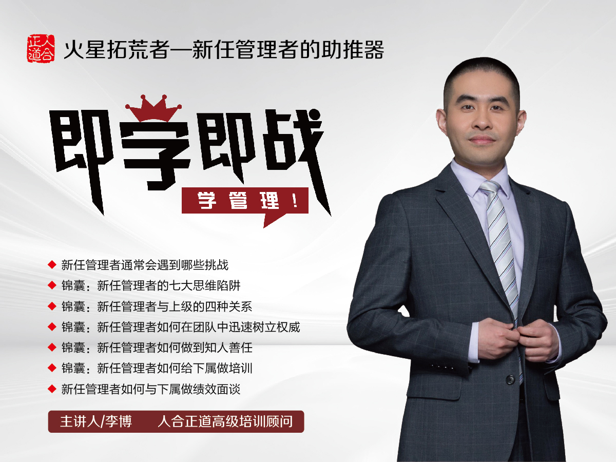 为此,我们邀请了人合正道高级培训顾问李博老师,带来《火星拓荒者 —— 新任管理者的助推器》课程。李博老师深耕管理培训领域,擅长拆解新任管理者的实战痛点,能将复杂的管理逻辑转化为可直接复用的方法,帮助新人快速完成角色转型。