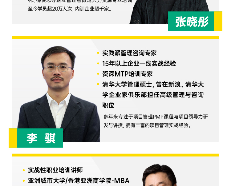 清华大学管理硕士,曾在新浪、清华大学企业家俱乐部担任高级管理与咨询职位多年来专注于项目管理PMP课程与项目领导力研发与讲授,拥有丰富的项目管理实战经验。