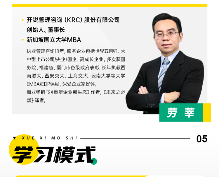新加坡国立大学MBA执业管理咨询18年,服务企业包括世界五百强、大中型上市公司/央企/国企、高成长企业。多次获国务院、福建省、厦门市各级政府表彰,长年执教西南财大、西安交大、上海交大、云南大学等大学EMBA/EDP课程,深受企业家好评。