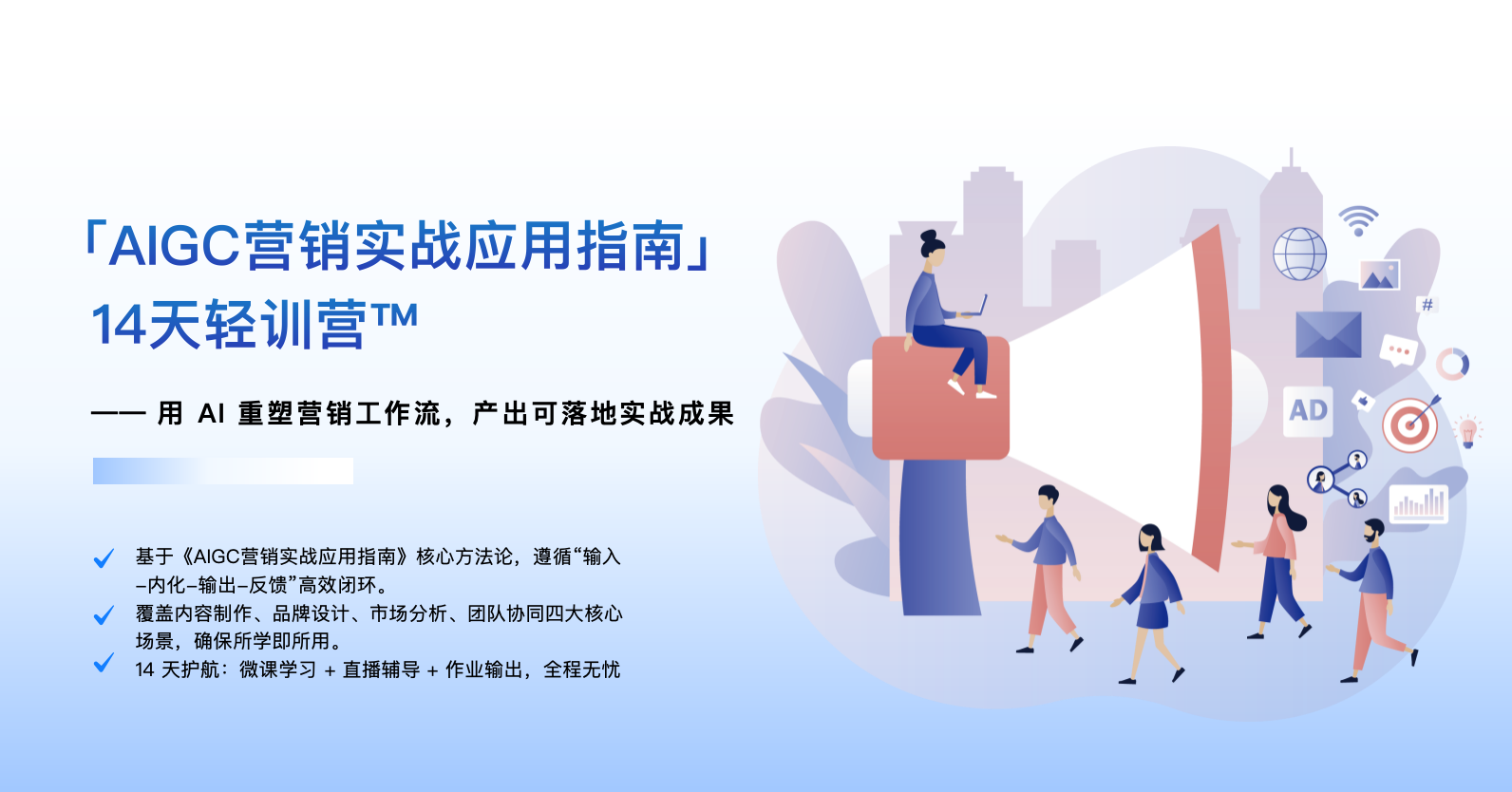 针对个人:掌握 AIGC 营销硬核技能,打造职业差异化优势,产出可直接落地的实战作品。